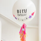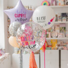 Globo de 60cm hinchado con helio y decorado con flecos de papel y estrellitas troqueladas, va atado a un tarrito de chuches.