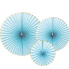 Pack de 3 abanicos de papel en color celeste, con borde dorado, las medidas de los diámetros son aprox. 40 cm, 32 cm, y 23 cm.
