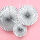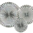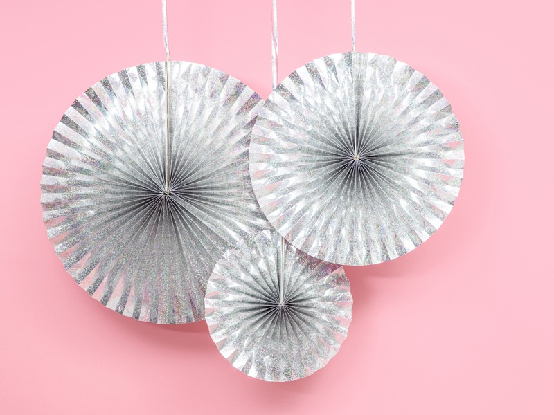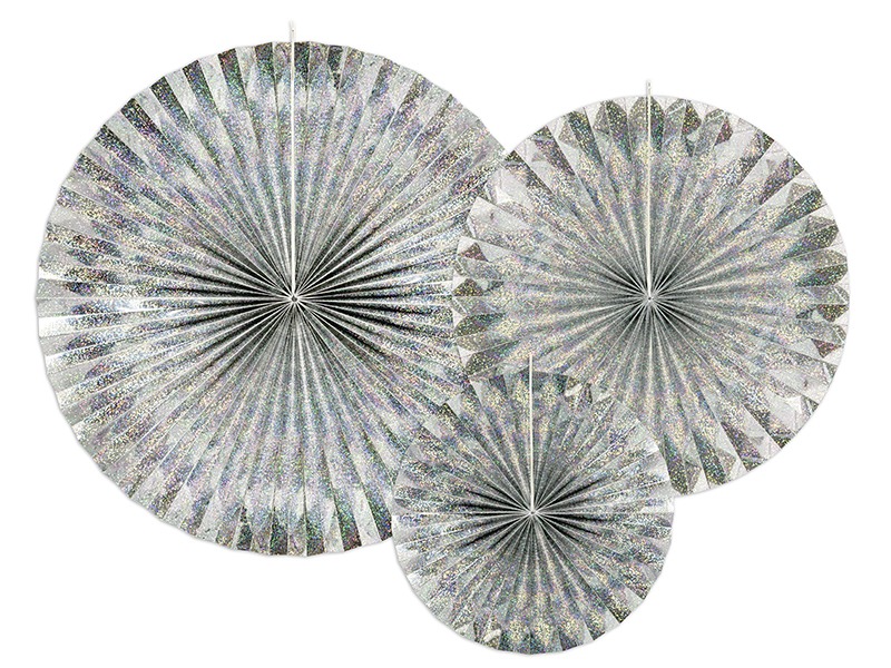 Pack de 3 abanicos de papel en color plateado holográfico, las medidas de los diámetros son aprox. 40 cm, 32 cm, y 23 cm.