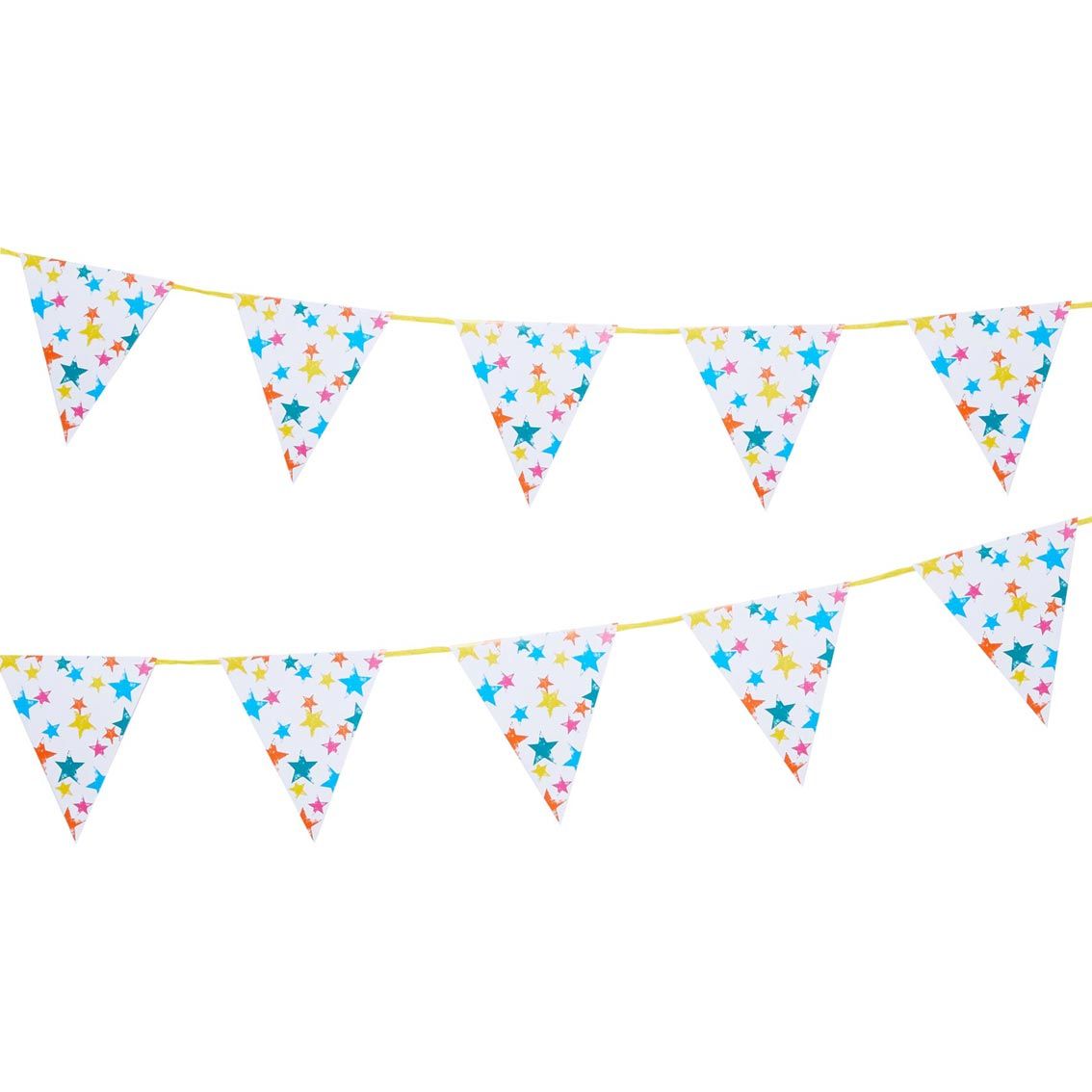 Banderín de papel reciclado con fondo blanco y estampado de estrellas multicolor. Mide 3m y tiene 12 banderines.