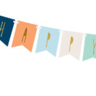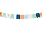 Banderín «Happy Birthday» en tonos azules, naranja, verde agua y letras doradas. Contiene un lazo de 2,5m, 13 banderines de8,5x11cm, todos juntos ocupan 1,40m.