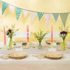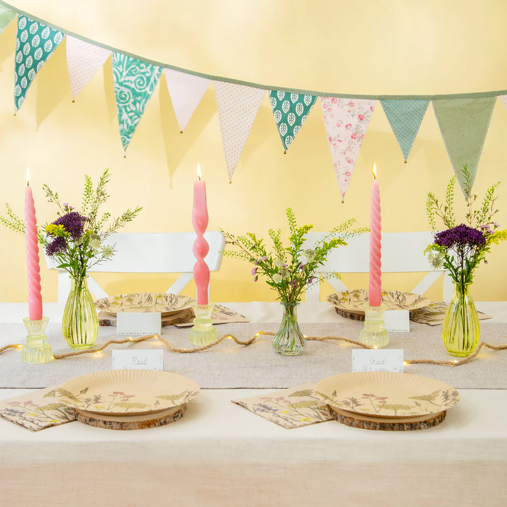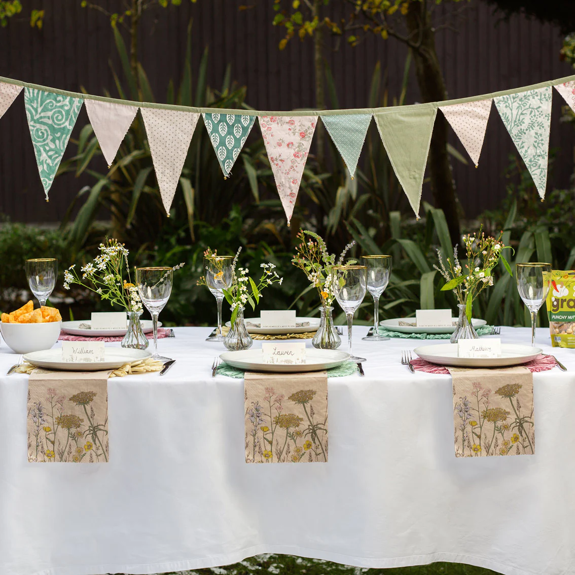 Bonito banderín de tela en multicolor estampado con flores, lunares, hojas con cascabeles en las puntas. Este banderín reutilizable está hecho a mano y con algodón 100% sostenible y lavable.Sirve tanto para exterior como para interior para dar un toque de color a cualquier cumple, fiesta en el jardín, habitación… Mide 2,50m y tiene 19 banderines.