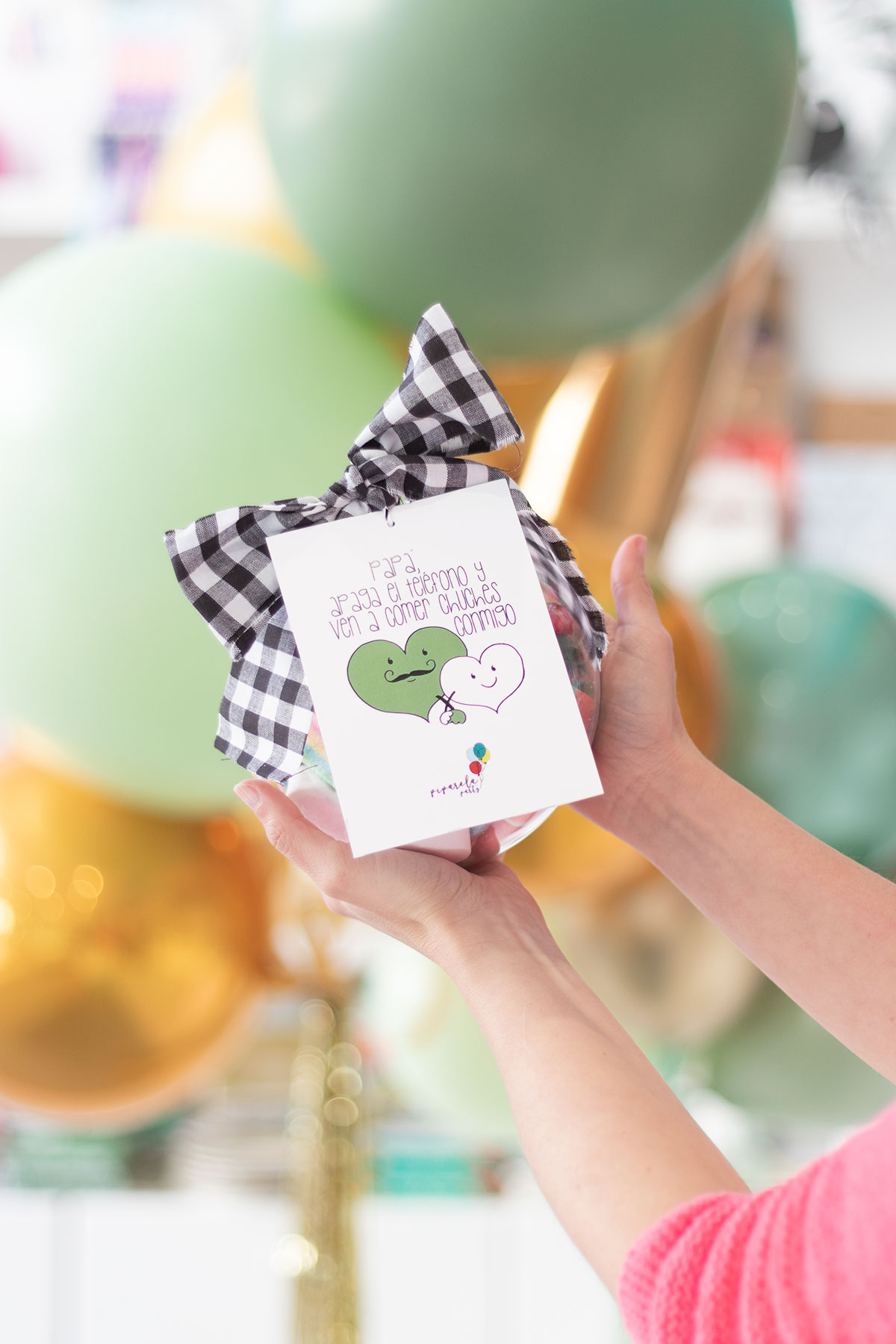 Bola de pvc apto para alimentación de 14cm de diámetro llena de chuches y con una lazada con un retal de tela. Lleva una tarjeta con un mensaje molón para regalar a ese padre tan especial!