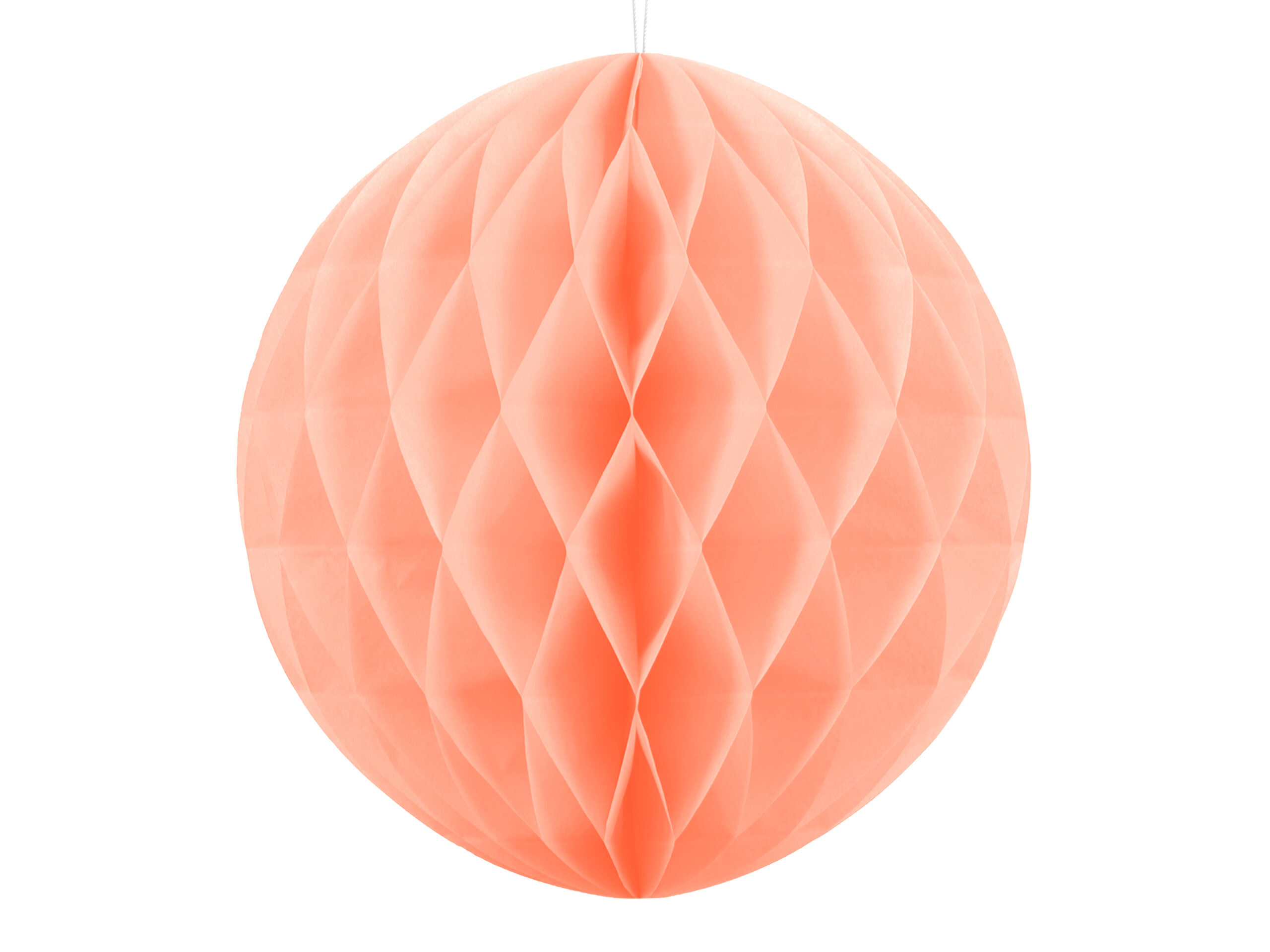 Bola de nido de abeja de papel seda en color melón. El producto viene plegado, listo para abrir y montar, trae una cuerdita para colgarlas.