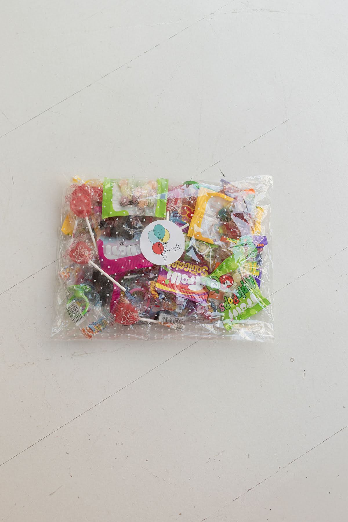 Bolsa de 400g aproximadamente de chuches surtidas. Contienen gominolas, piruletas y caramelos, todos empaquetados en bolsitas individuales, perfectos para meter en las piñatas o en las bolsitas sorpresa.