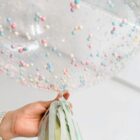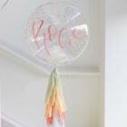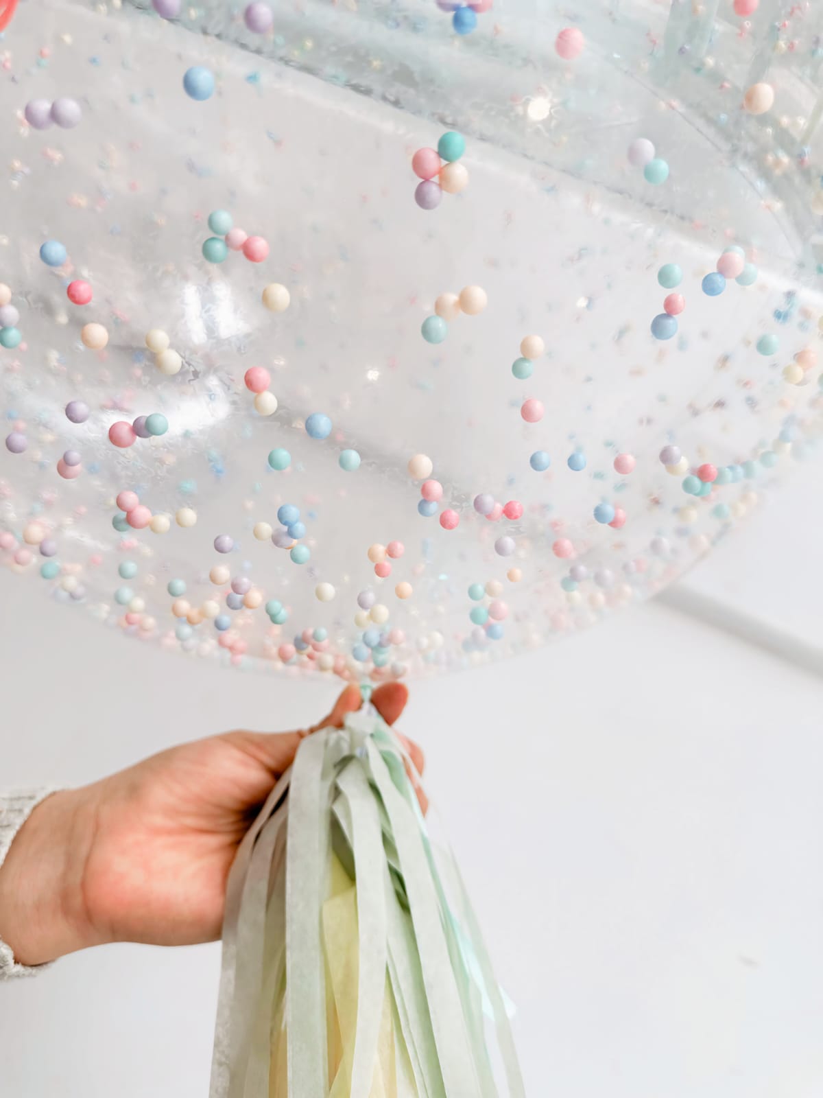 Globo burbuja de 60cm de diámetro hinchado con helio y relleno con mini bolitas en tonos pastel. Decorado con flecos de papel seda en los mismos tonos. Podrás personalizarlo con el texto que quieras y elegir el peso al que va atado.