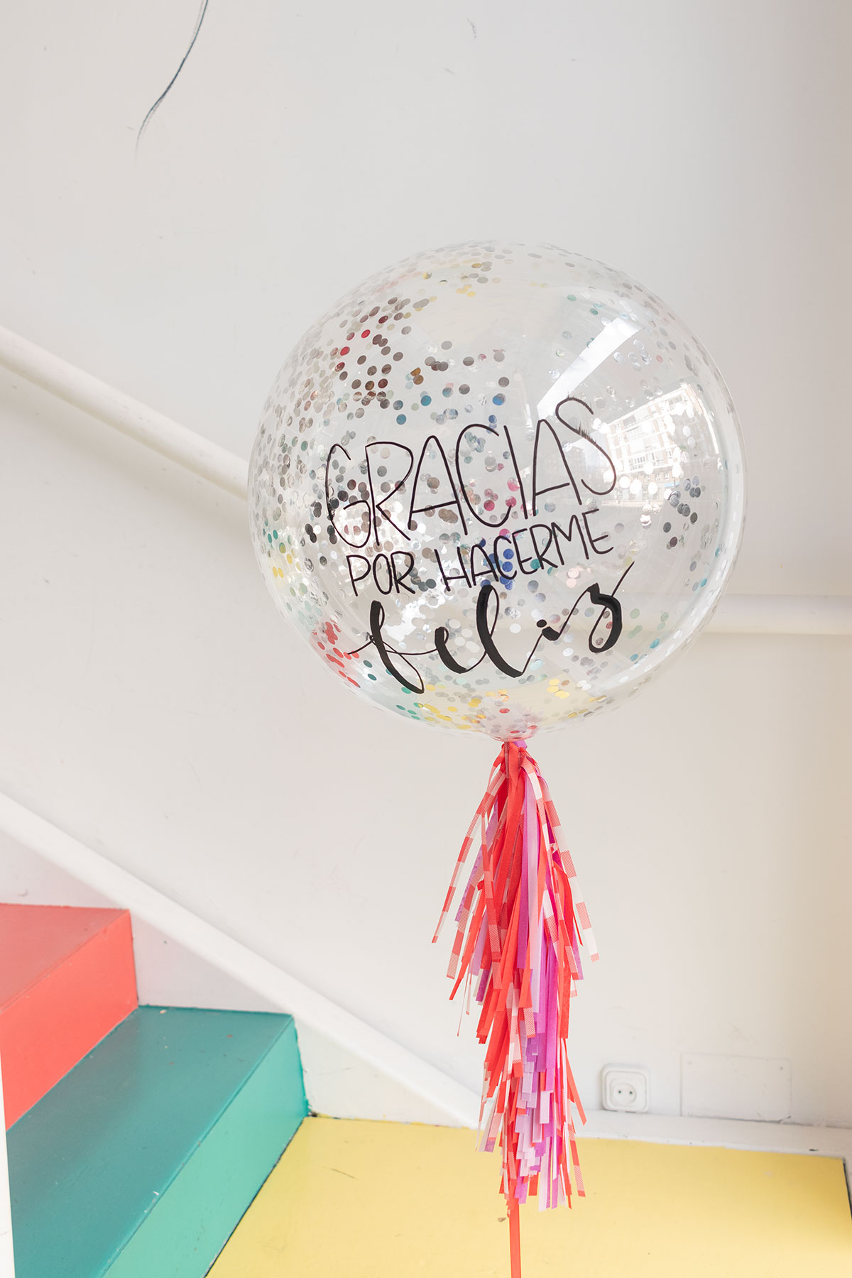 Globo burbuja de 60cm hinchado con helio, relleno de confetti en color plata, decorado con flecos y atado a un tarrito de chuches.