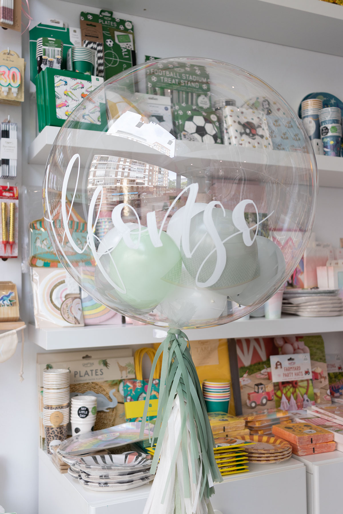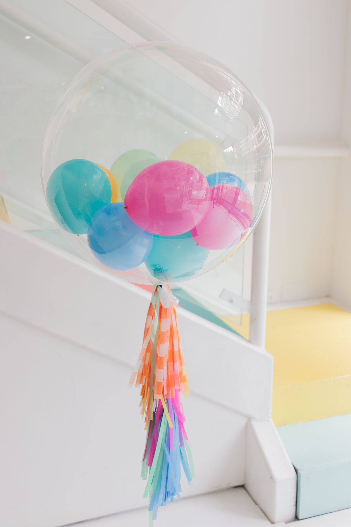 Globo burbuja de 60cm de diámetro hinchado con helio y relleno con mini globos multicolor. Decorado con flecos de papel seda en los mismos tonos. Podrás personalizarlo con el texto que quieras y elegir el peso al que va atado.