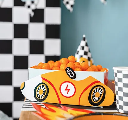 Cajas con forma de Coches hechos de papel, contiene 3 cajas y 6 elementos de papel con forma de coche. Miden aproximadamente 7,5 x 17 cm.