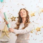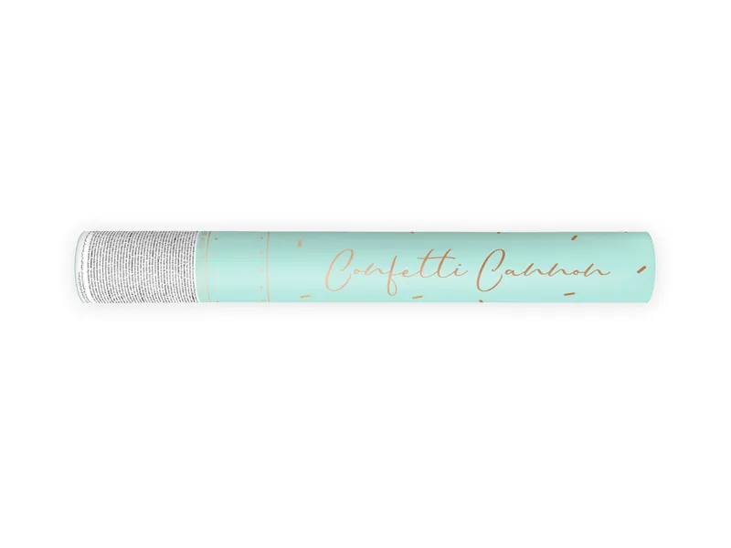 Cañon de confetti color oro rosa, el cañon mide 40cm y el confetti son papelitos metalizados de color oro rosa de forma rectangular.