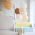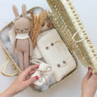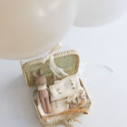 Bontio capazo para recién nacidos hecho a mano en Valencia con palmito. Contiene conejito de crochet, jersey, braguita y patucos de punto de algodón 100% orgánico, todo hecho a mano de la firma «Manuel&Manuela baby». La cesta lleva atado un ramo de globos de látex biodegradable para que la entrega del regalo sea aún más espectacular.