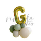 Bonito centro de mesa de globos de látex biodegradable en tonos blanco, eucalipto y oro con un globo de foil metalizado en color oro con forma de la inicial que elijas, todos hinchados con aire. La base mide 30x30cm aproximadamente y 50cm de alto.