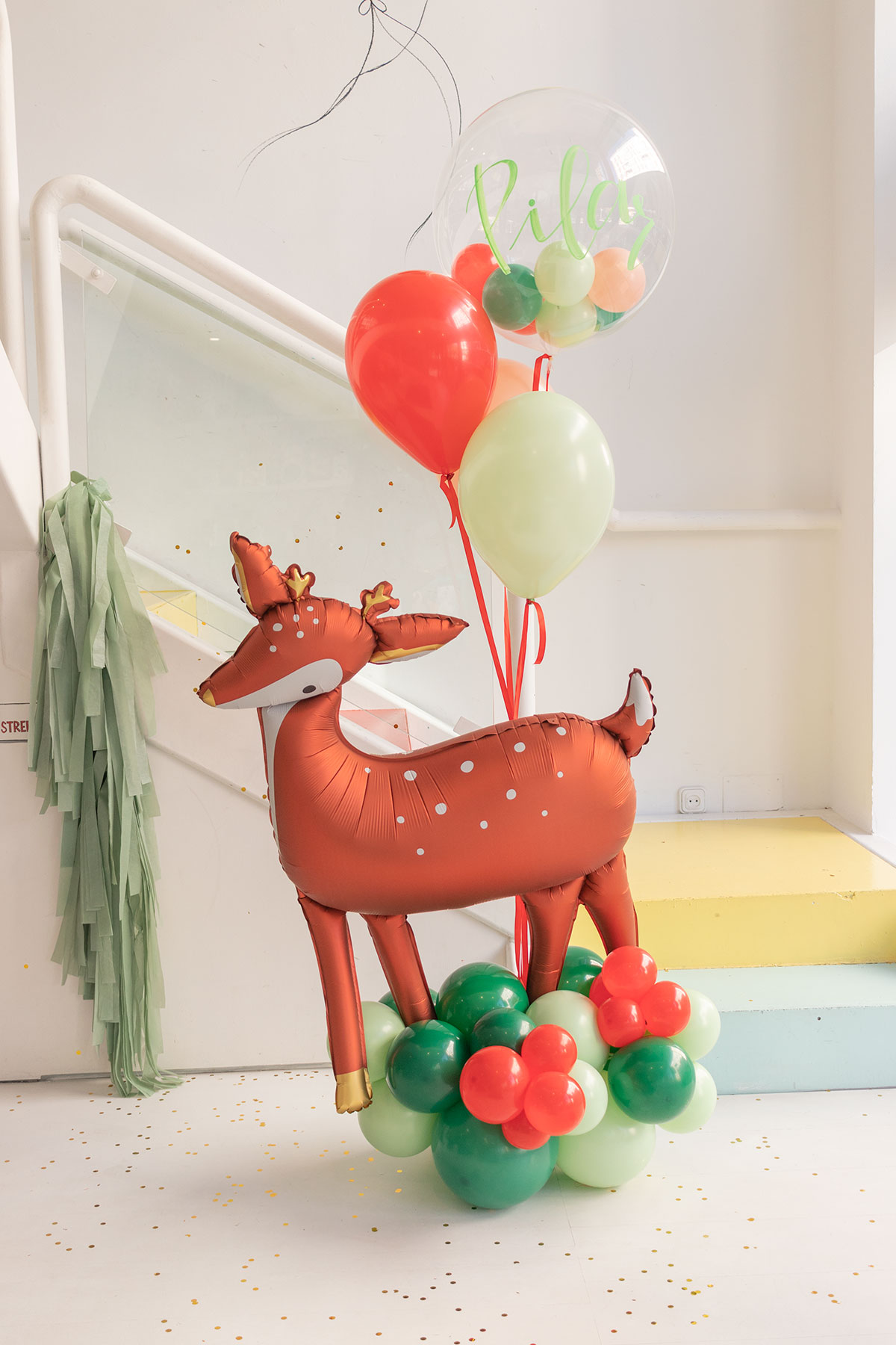 Y si cuando se despierten se encuentran al Elfo sentado en este reno?? Es un globo con forma de reno de casi 1m de largo, apoyado sobre una base de globos y lleva atado un globo burbuja con globitos que podrás personalizar con el texto que quieras y 3 globos látex.