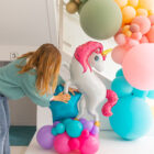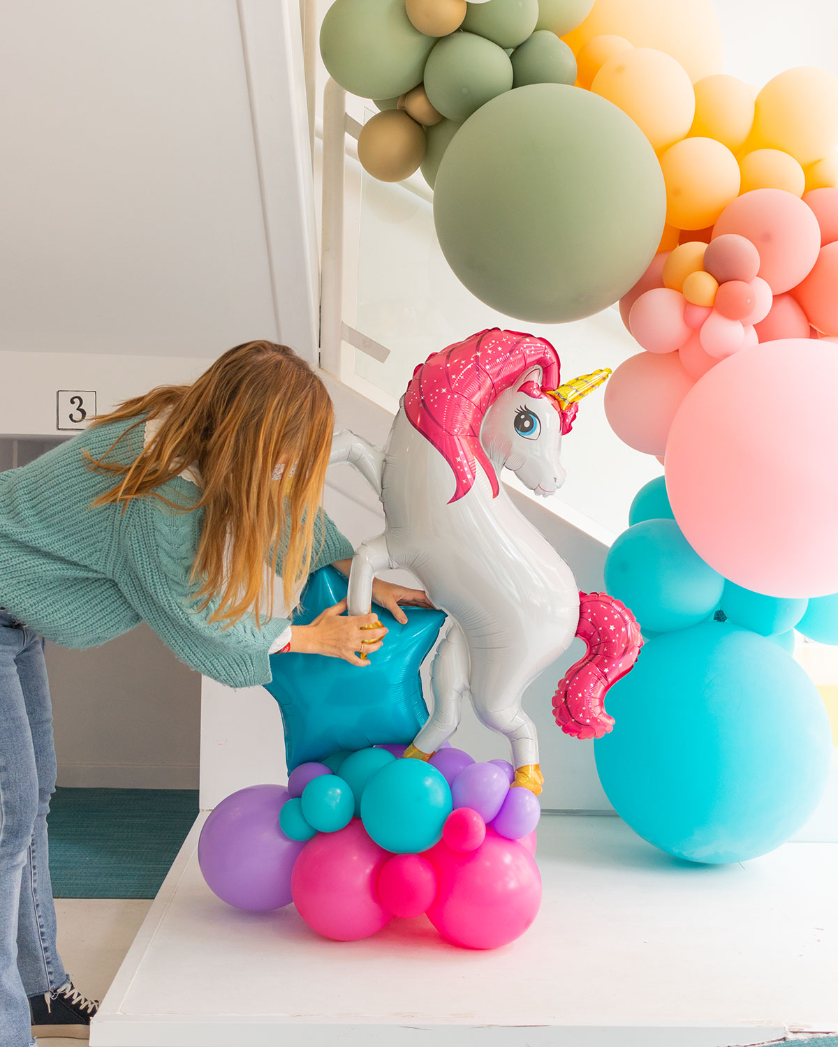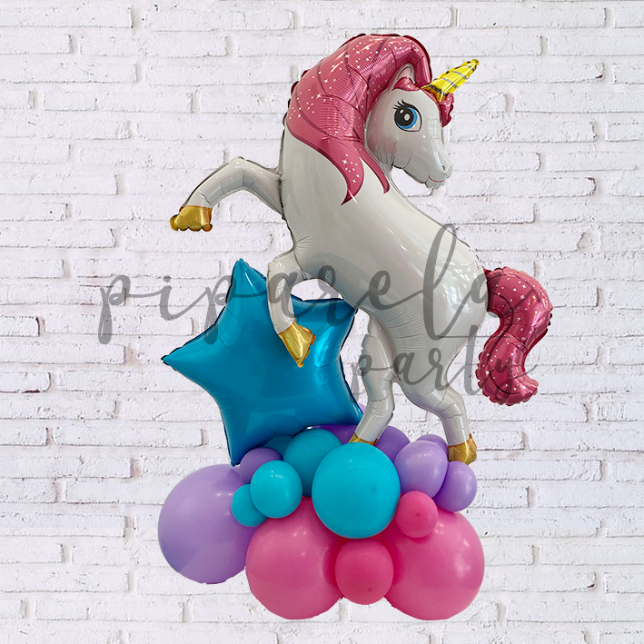 Centro de globos hinchados con aire compuesto por un globo con forma de unicornio de 80cm de largo aprox., una estrella de foil metalizado y una base de globos de látex biodegradable. Los colores de la base y la estrella pueden variar. Puedes añadir un nombre a la estrella si lo deseas.