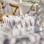 Bandeja blanca de cartón con 24 conos de papel con 168gr de confetti blanco. Listo para llevar a la puerta de la boda y repartir entre los invitados.