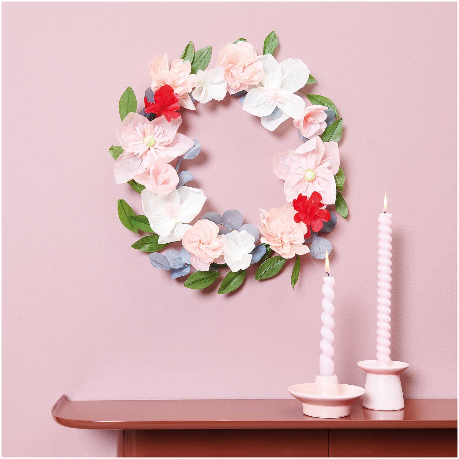 Corona de flores de papel de 50cm de diámetro, las hojas están sujetas por hilos de metal, lo que permite darles la forma que desees.