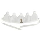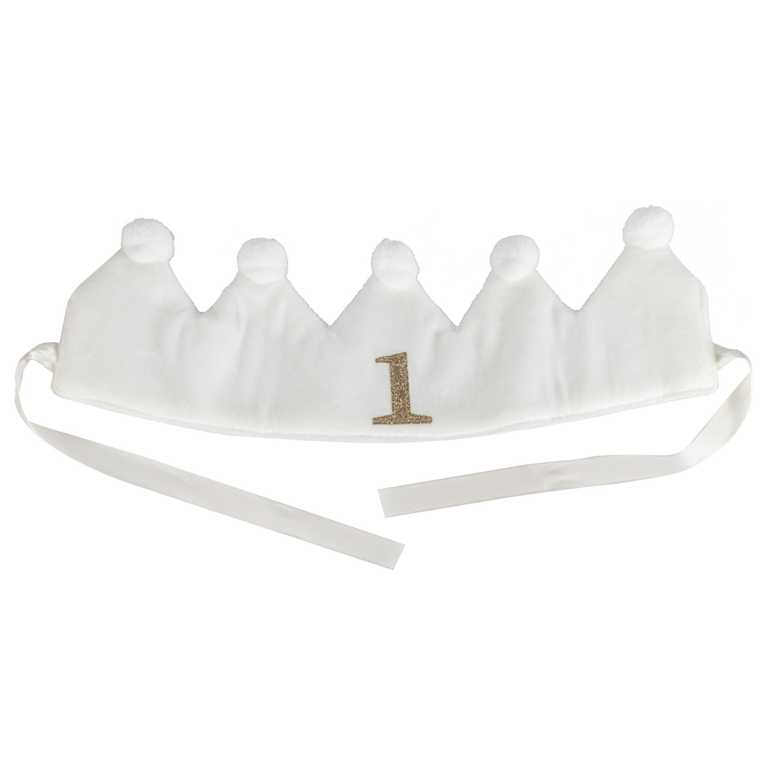 Corona de tela en color blanco, decorada con pompones blancos, número 1 en dorado y lazo para que se adapte perfectamente a cualquier cabecita. La corona mide 12cm x 40cm