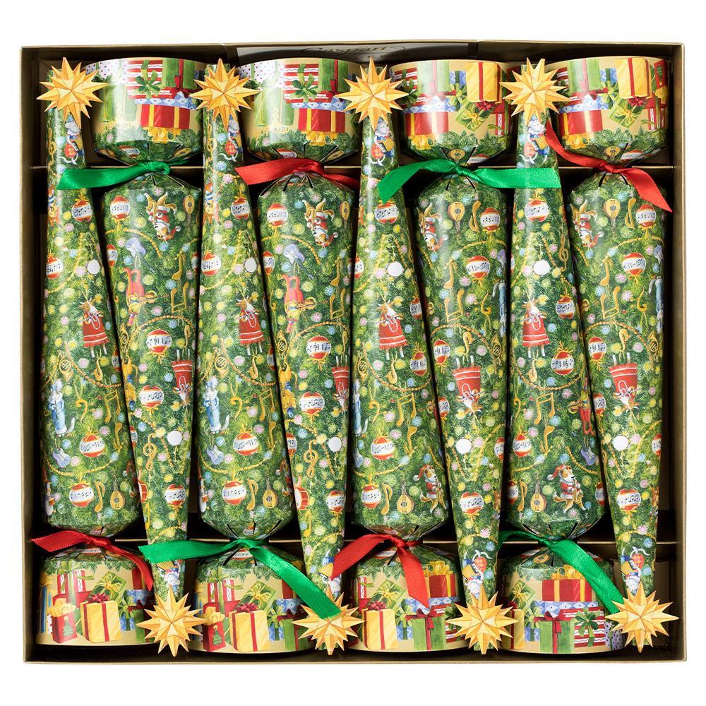 8 crackers navideños con forma de árbol de navidad, cada cracker lleva un regalo, una corona y un mensaje. Miden 30cm de largo.