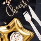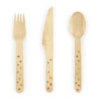 Pack de 18 cubiertos de madera para 6 comensales, con cuchara, tenedor y cuchillo, decorado con estrellas doradas.