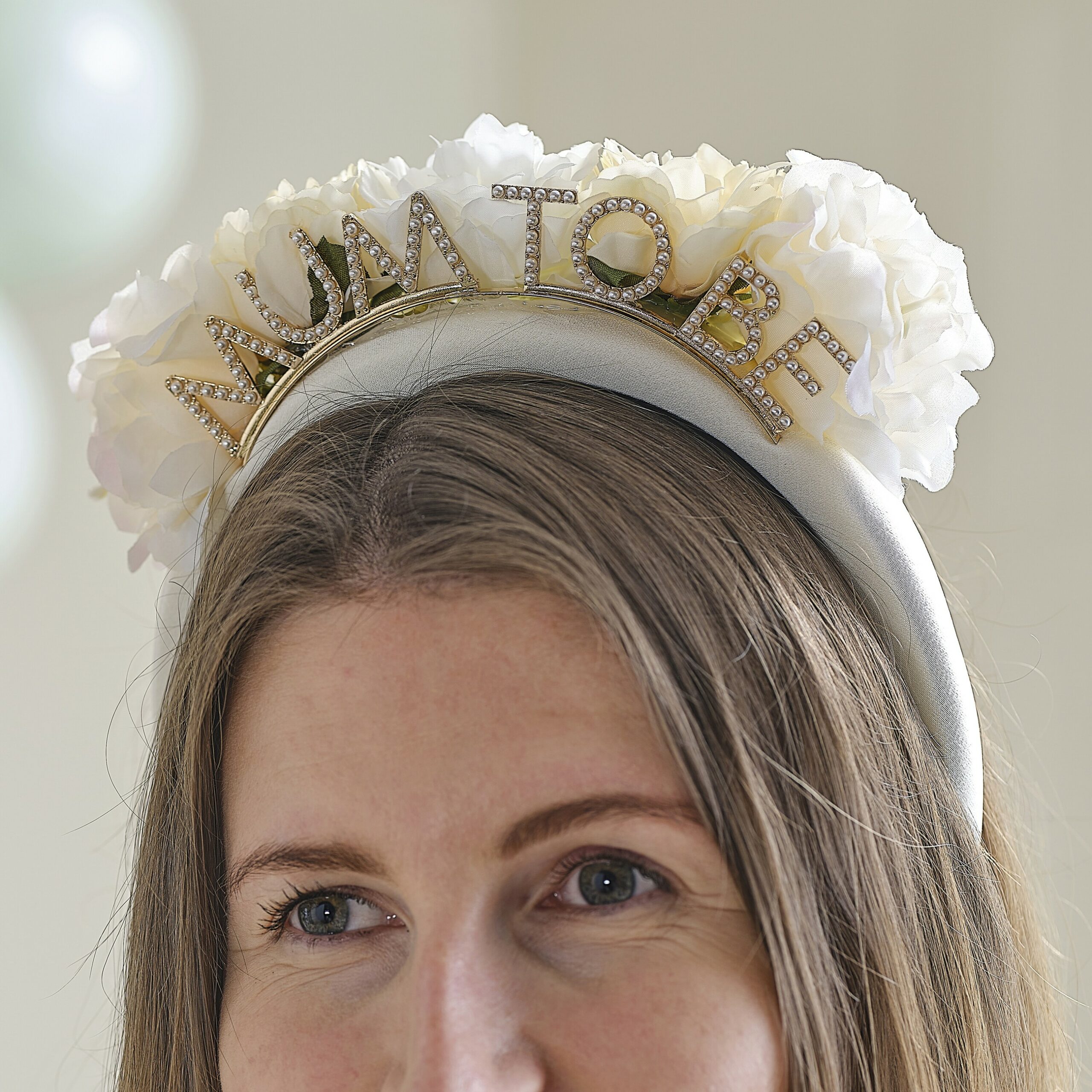 Diadema para Baby Shower con flores sintéticas y letras con perlas “MUM TO BE”