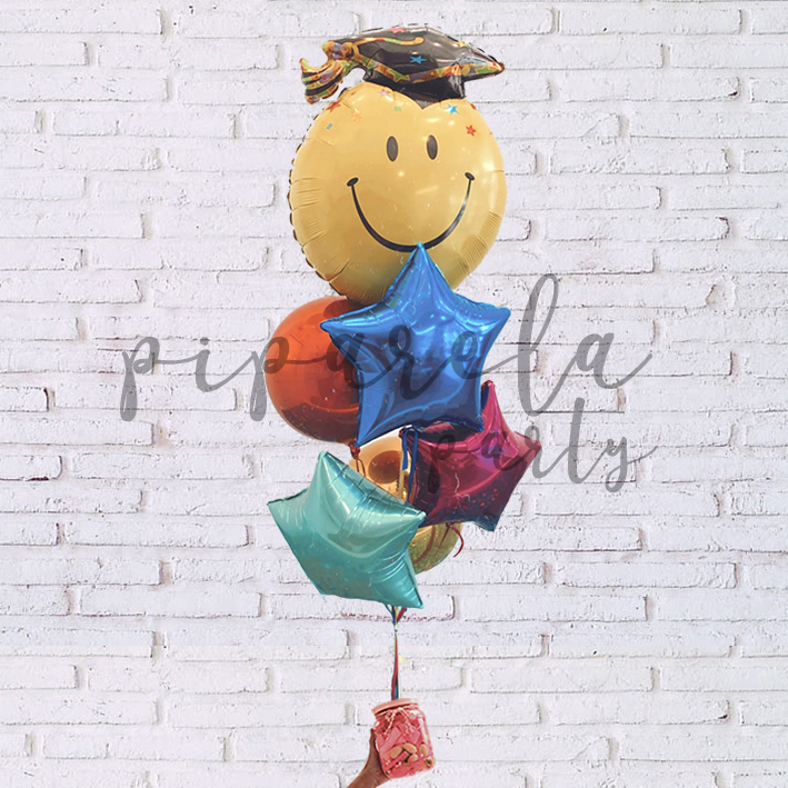 Ramillete de globos “Enhorabuena”. Incluye globo de foil de 80cm con forma de cara feliz con un birrete de graduación, 3 estrellas de foil de 40cm en distintos colores y 2 bolas de foil de 40cm en distintos colores. Todos van atados a un tarro de chuches.