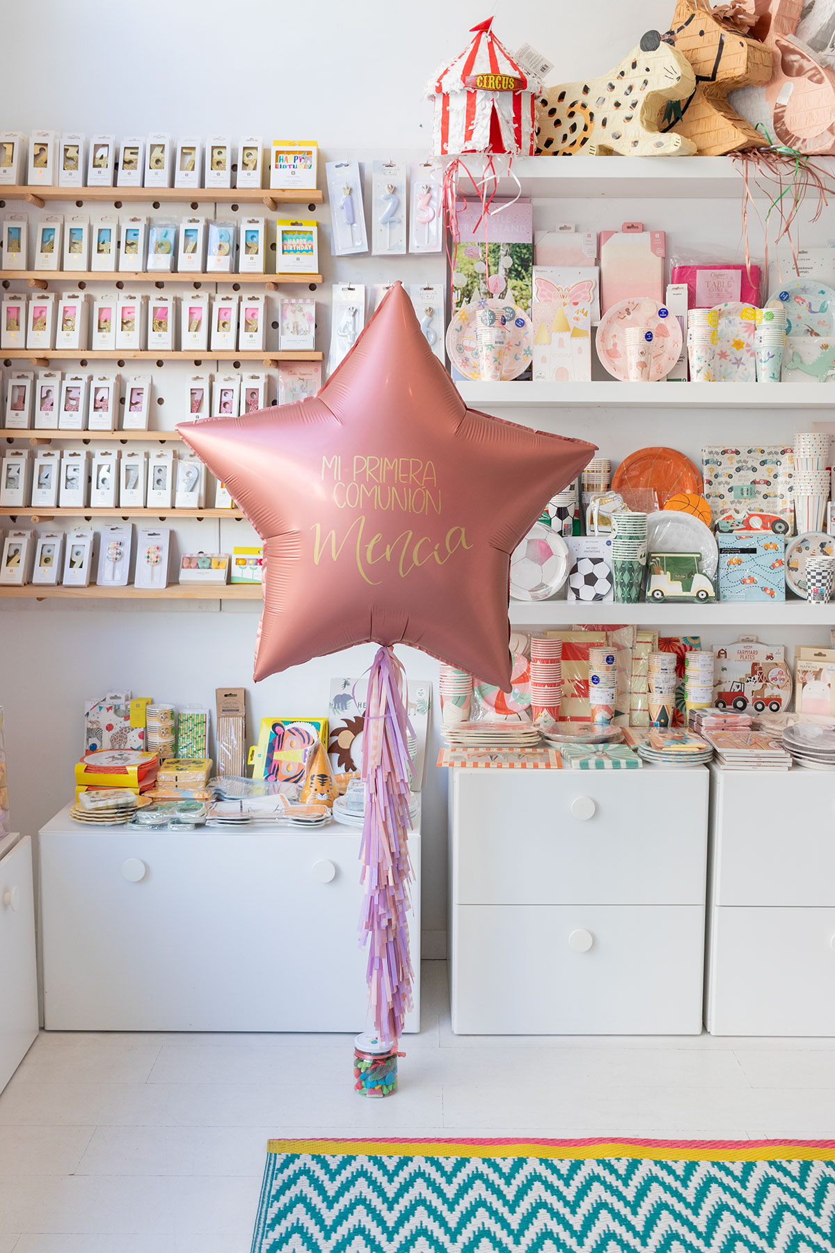 Globo de foil en forma de estrella hinchada con Helio, mide 90cm y va decorado con un súper fleco de papel seda de 70cm en tonos multicolor. Podrás personalizarlo con un texto corto y elegir el peso al que va atado.