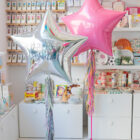 Globo de foil en forma de estrella hinchada con Helio, mide 90cm y va decorado con un súper fleco de papel seda de 70cm en tonos multicolor. Podrás personalizarlo con un texto corto y elegir el peso al que va atado.