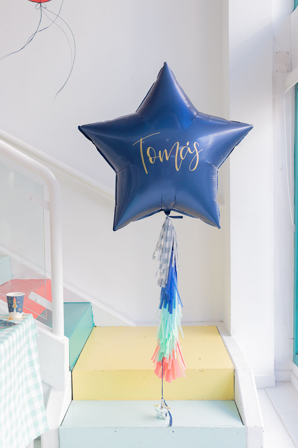 Globo de foil en forma de estrella hinchada con Helio, mide 90cm y va decorado con un súper fleco de papel seda de 70cm en tonos multicolor. Podrás personalizarlo con un texto corto, elegir el color del globo y el peso al que va atado.