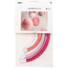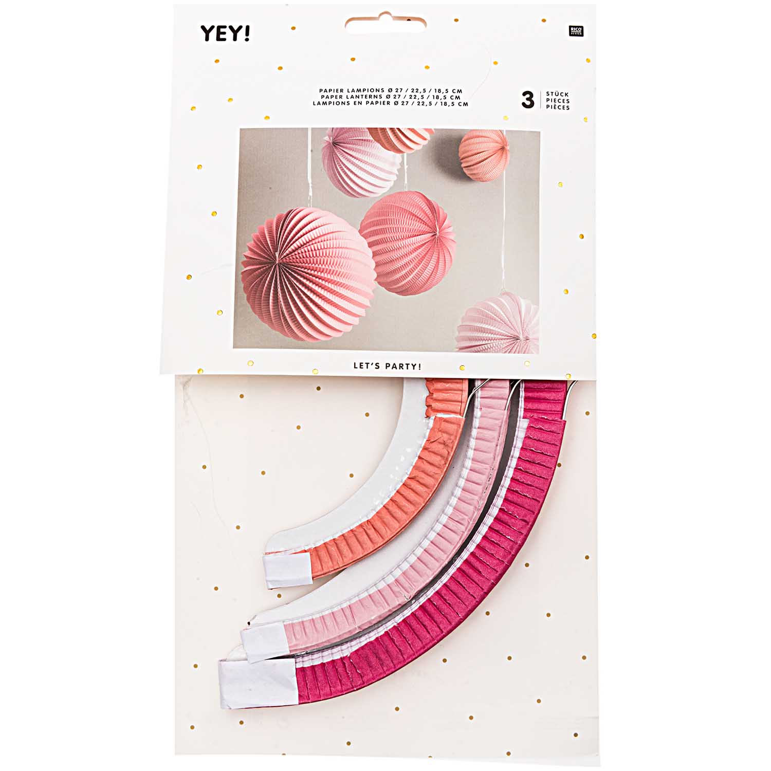 Pack de 3 farolillos de papel, 1 de cada color y tamaño (27cm, 22,5cm y 18,5cm). El producto viene plegado listo para abrir y montar, NO INCLUYE CUERDA.