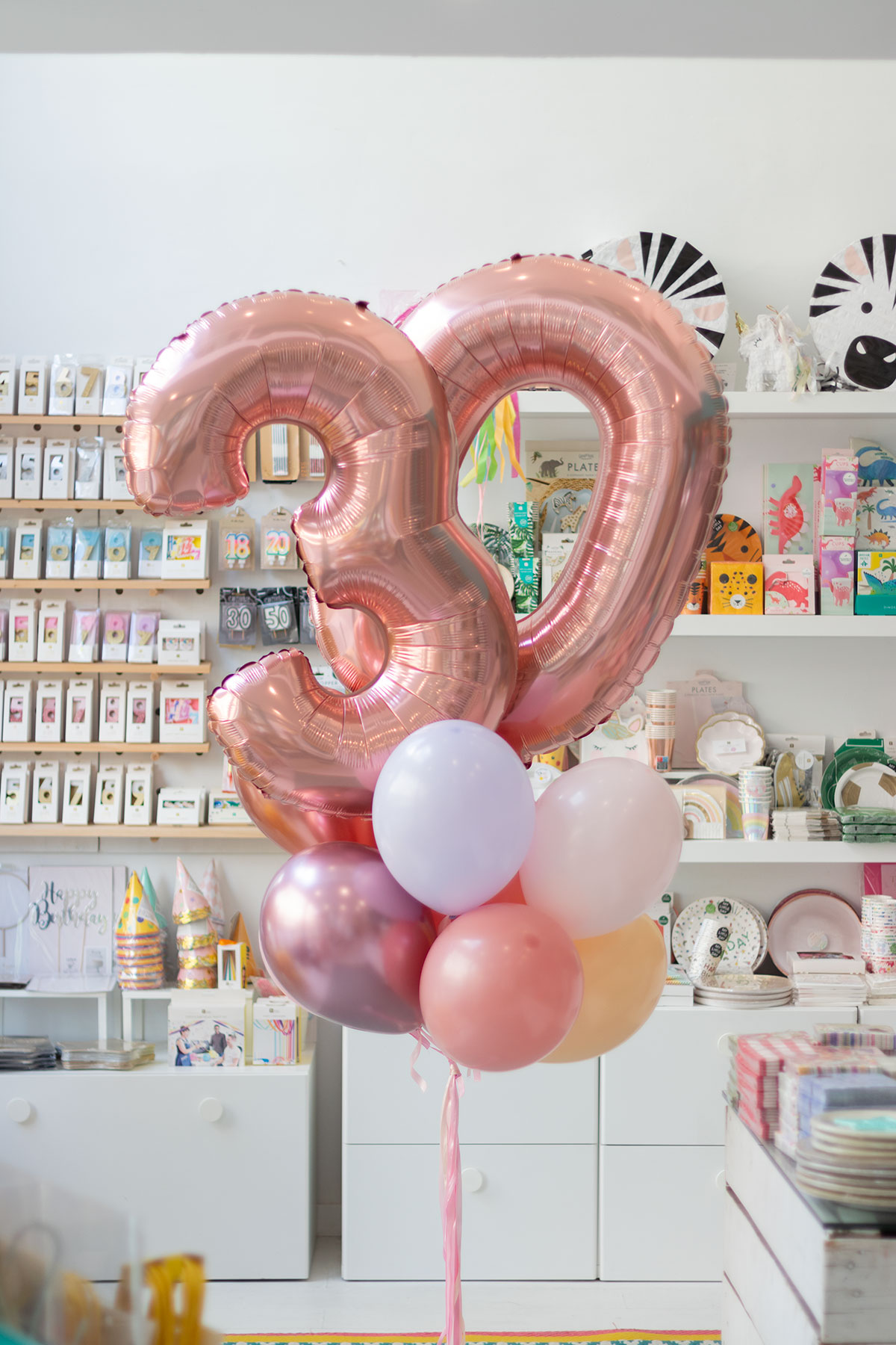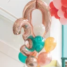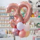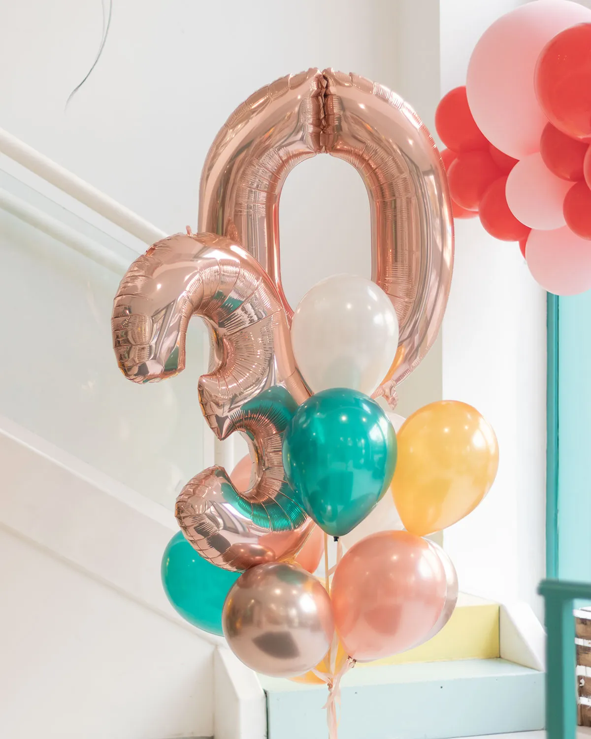 Ramillete de globos “feliz cumpleaños”. Incluye 2 globos de foil de 80cm con forma de número color oro rosa y 10 globos látex en tonos dorado, rosa, verde y blanco perlados o en tonos rosas, lilas y coral. Podrás elegir el peso al que van atados.