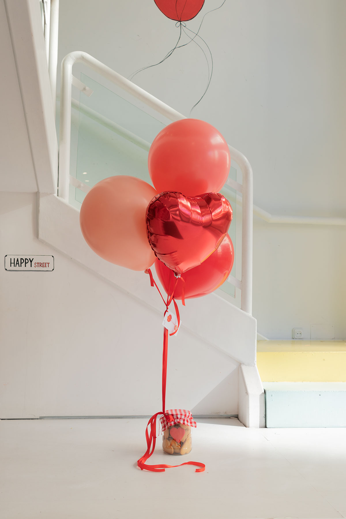 Súper tarro relleno con 36 deliciosas galletas, atado a 3 globos de latex de 40cm y 1 globo con forma de corazón hinchado con helio. Podrás personalizarlo con el texto que quieras.