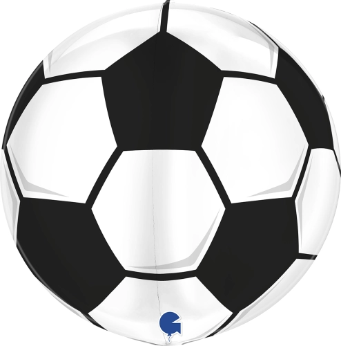 Globo de foil metalizado con forma de balón de fútbol, mide 40cm aprox. y está hinchado con helio.