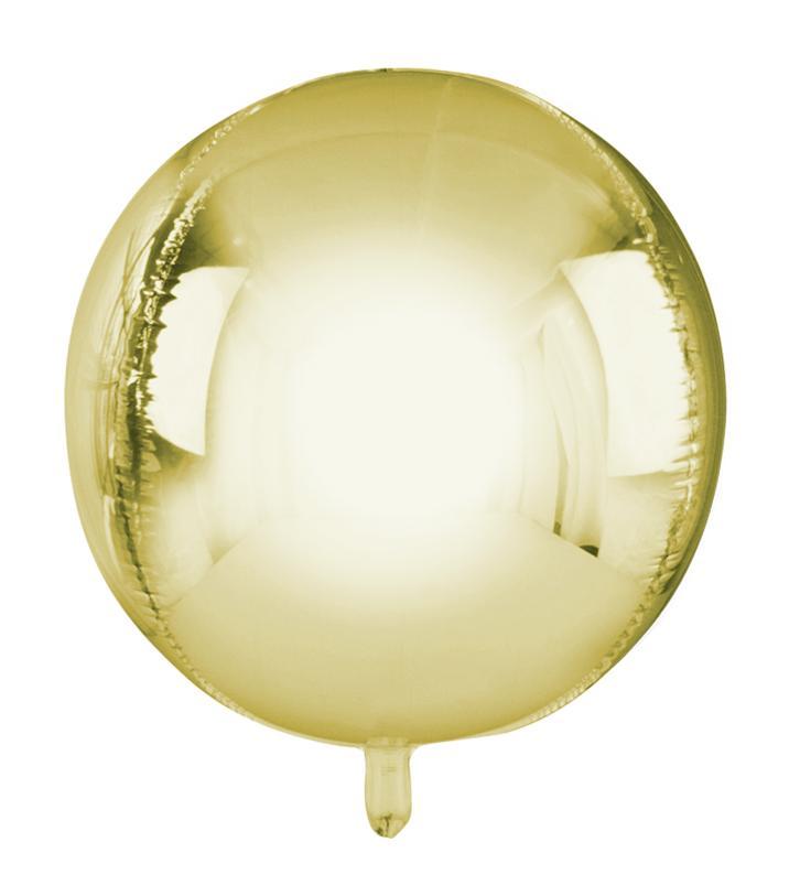 Globo de foil metalizado con forma esférica color oro hinchado con helio. Hay 2 tamaños: 40cm y 80cm.