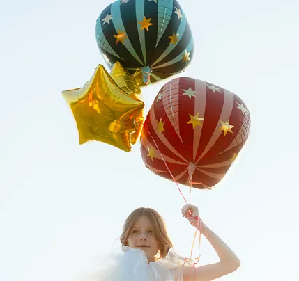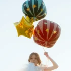 Globo de foil metalizado con forma de bola, con rayas en color verde, estampado con estrellas doradas. Mide 50cm aprox. y está hinchado con helio.
