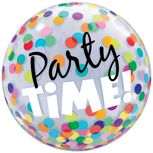 Globo esférico transparente con un estampado que simula confetti que contiene el texto «Party Time», mide 56cm. de diámetro hinchado con helio.