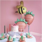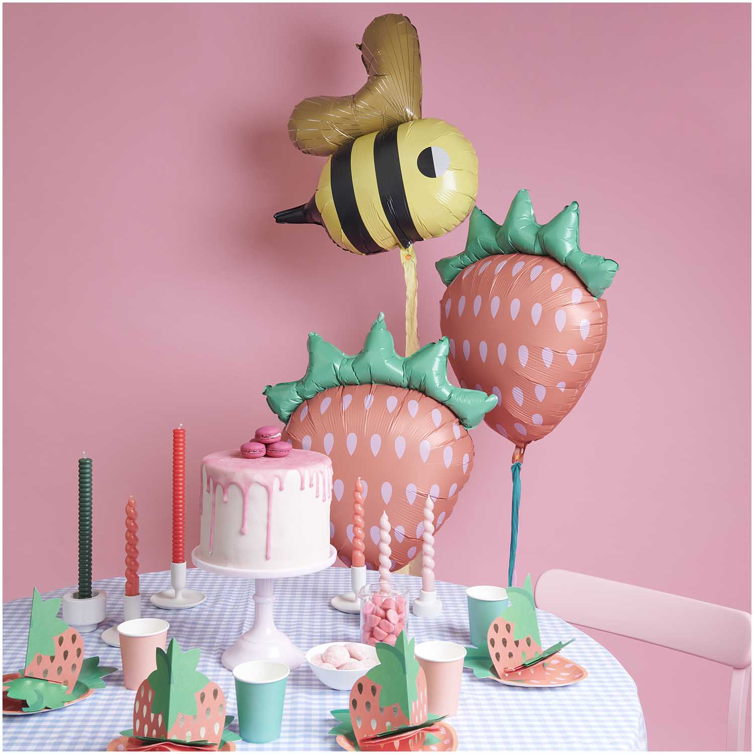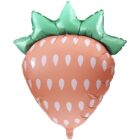 Globo de foil con forma de fresa en tono coral y rosa , mide 55 x 65 cm esta hinchado con helio.