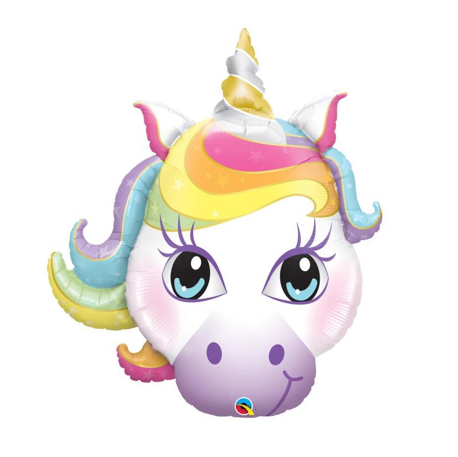 Globo de foil con forma de carita de unicornio, que mide 97cm. de alto, y está hinchado con helio.