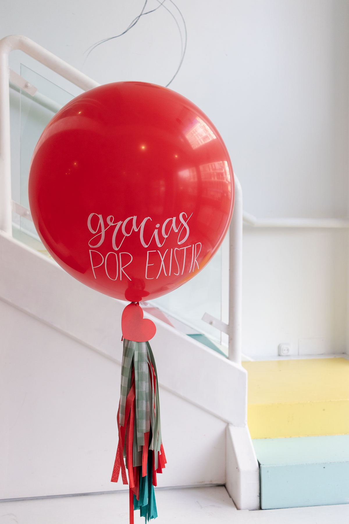 El globo más grande de 90cm hinchado con helio y decorado con flecos y con un bonito corazón atado a un tarro de chuches. Podrás personalizarlo con el texto que quieras y elegir la combinación de los flecos: eucalipto (como la de la foto) o coral (rojo, coral, oro rosa).