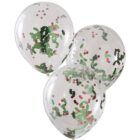 Pack de 5 globos de látex transparente con confetti con forma de muérdago en su interior. Cada globo mide 30cm de diámetro y están hinchados con helio.