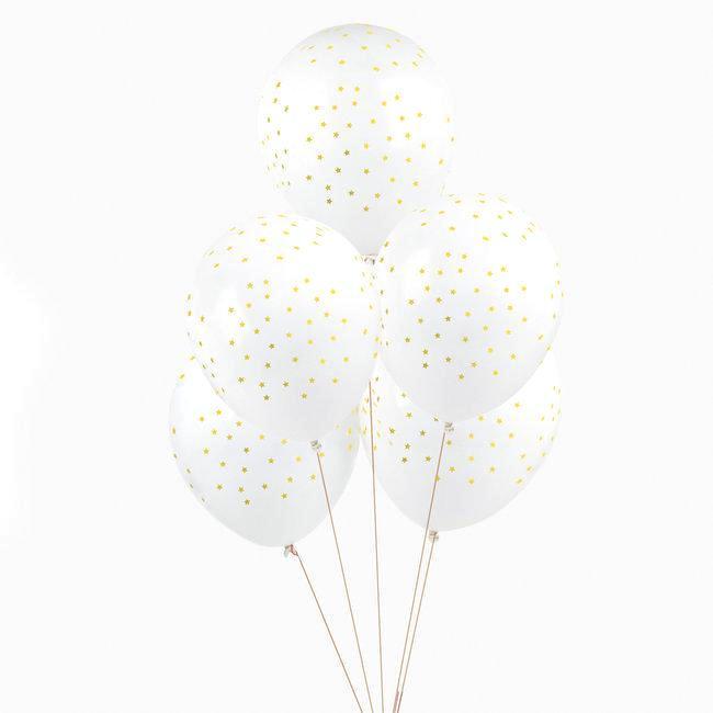 Pack de 5 globos estampados de látex biodegradable blancos con estrellas en dorado, miden 28cm. de diámetro.