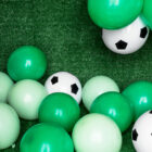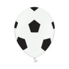 Pack de 5 globos de látex biodegrable blanco mate estampados de fútbol. Miden 28cm de diámetro.