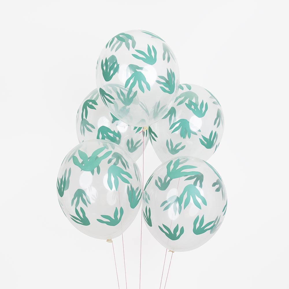 Pack de 5 globos de látex 100% ecológico pintados con tintes vegetales en EU, son transparentes estampados con pisadas de dinosarios en color verde, están hinchados con helio.