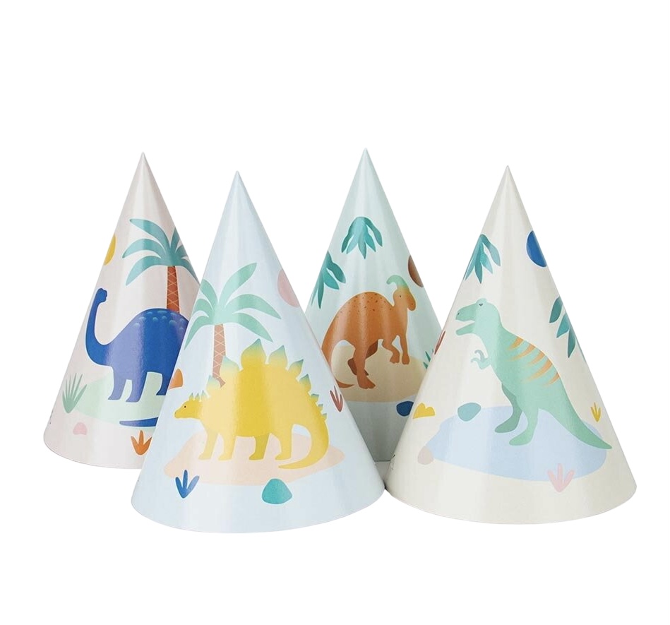 Pack de 8 gorros de cumpleaños de cartón  estampados con dibujos de dino, miden 16cm de alto x 10cm de diámetro aprox. Incluye goma elástica para sujetarlo a la cabeza.