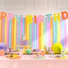 Guirnalda de fieltro en colores muy llamativos, unidas mediante una cinta dorada. Cada letra mide 15cm, están cosidas y rellenas de algodón.