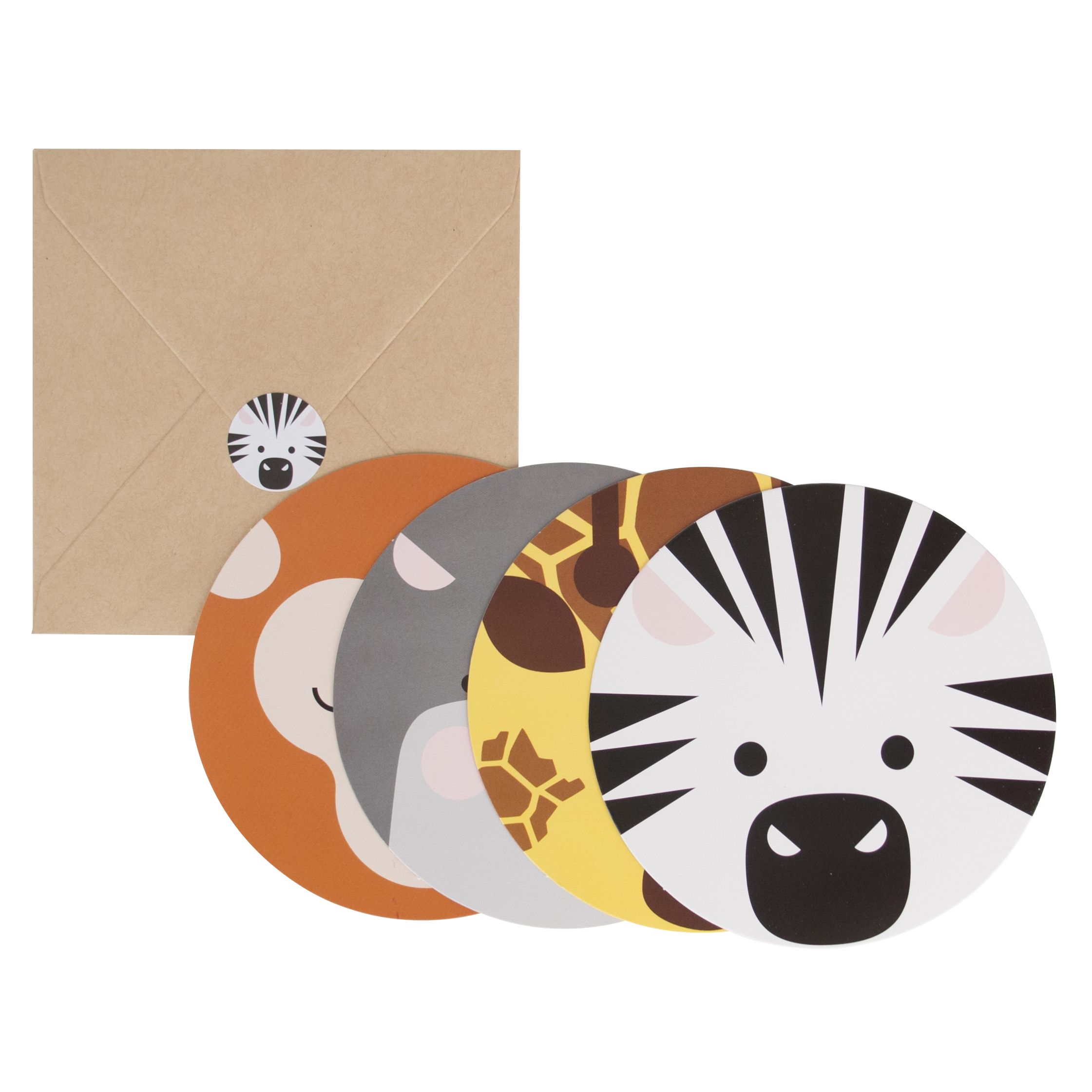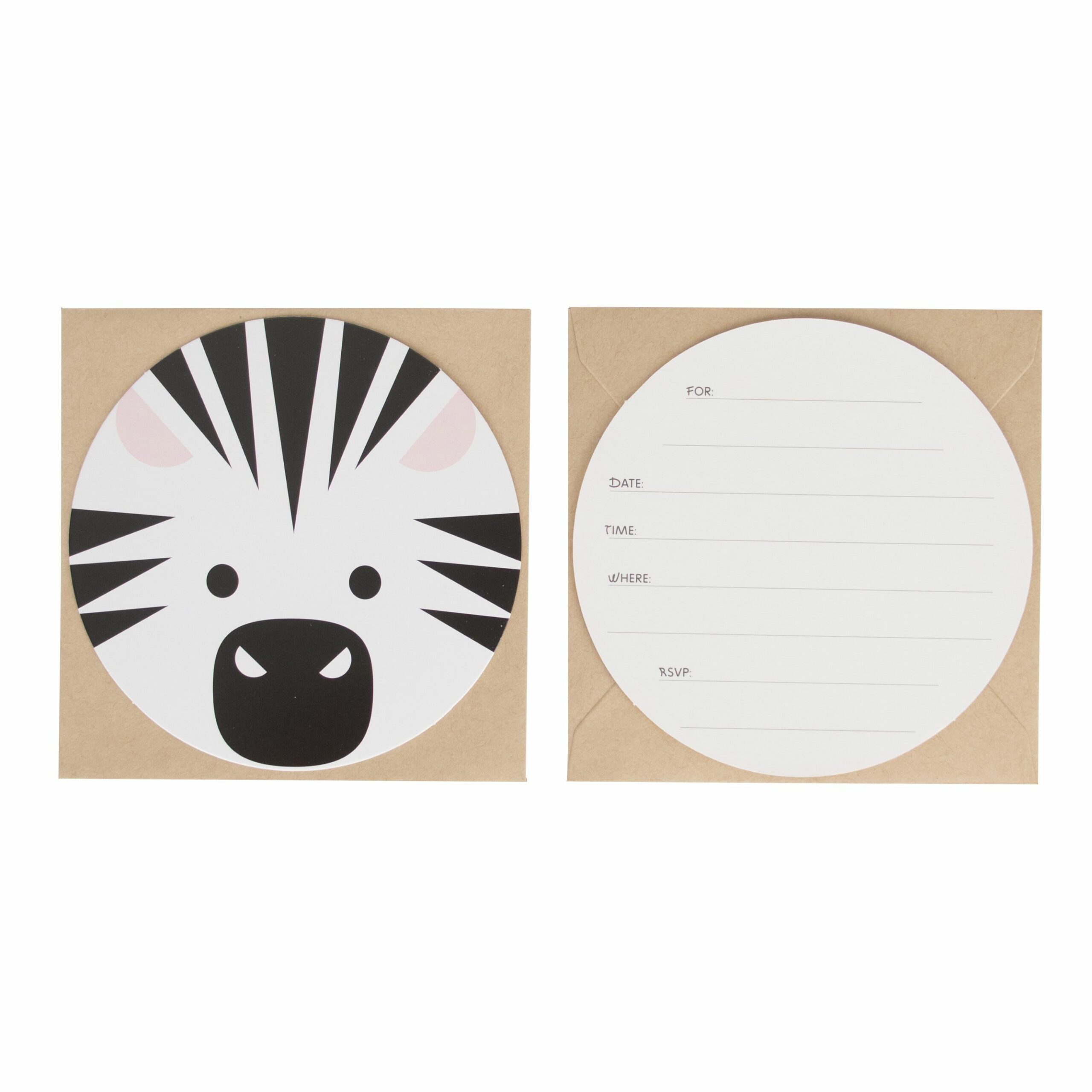 Pack de 8 invitaciones con caras de animales de safari. Son redondas con 2 caras, por un lado la cara del animal y por el otro los campos para rellenar. Miden 12cm de diámetro. Vienen con sobres kraft y unas pegatinas para cerrarlos.