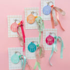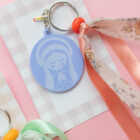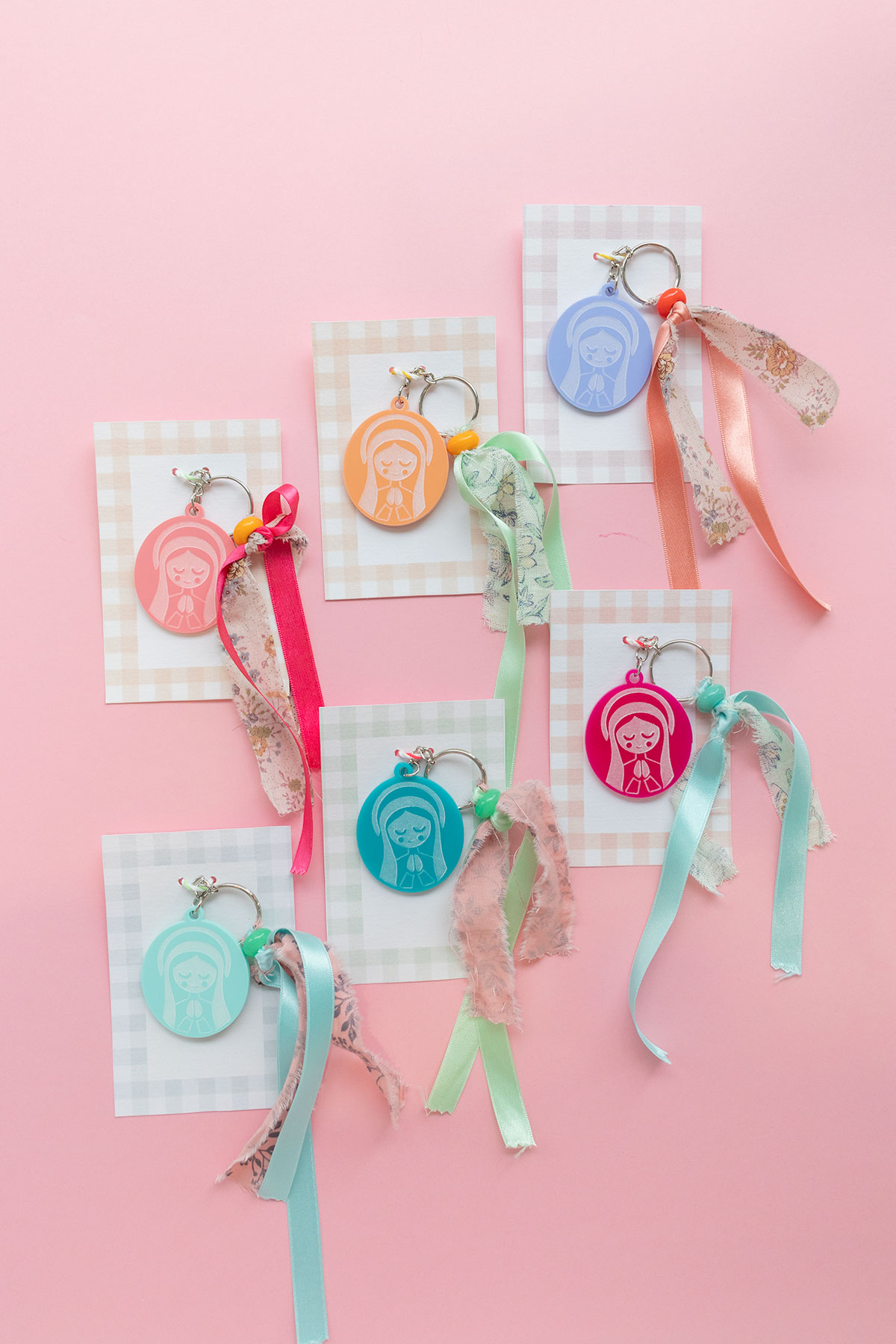 Llavero con detalle de medalla virgencita, decorado con retales de cinta y tela, un detalle diferente para dar en la comunión. Viene presentada en una tarjeta con el borde en vichy, empaquetada individualmente en una bolsita. Se preparan en mix de colores.