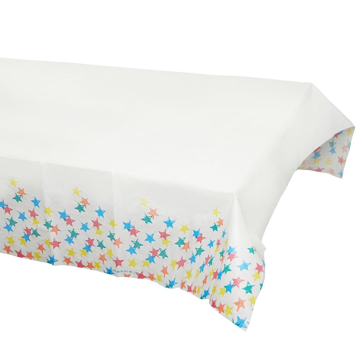 Mantel de papel reciclado con fondo blanco y estampado de estrellas multicolor. Mide 180x120cm