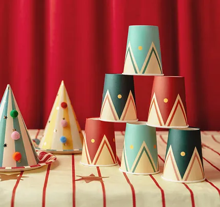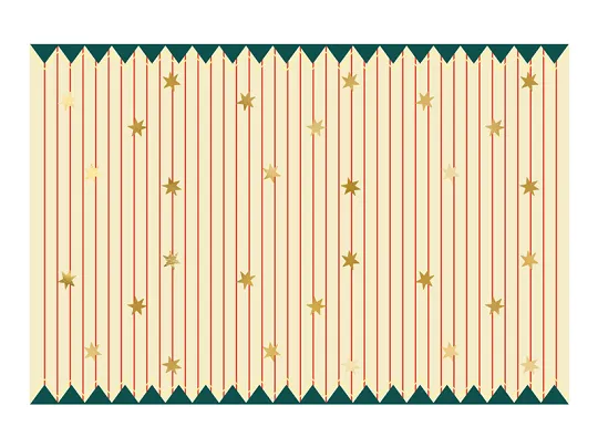 Mantel de papel con rayas finas en color rojos y estrellas doradas, en los laterales trae detalles en color verde azulado. Mide 180 x 120 cm