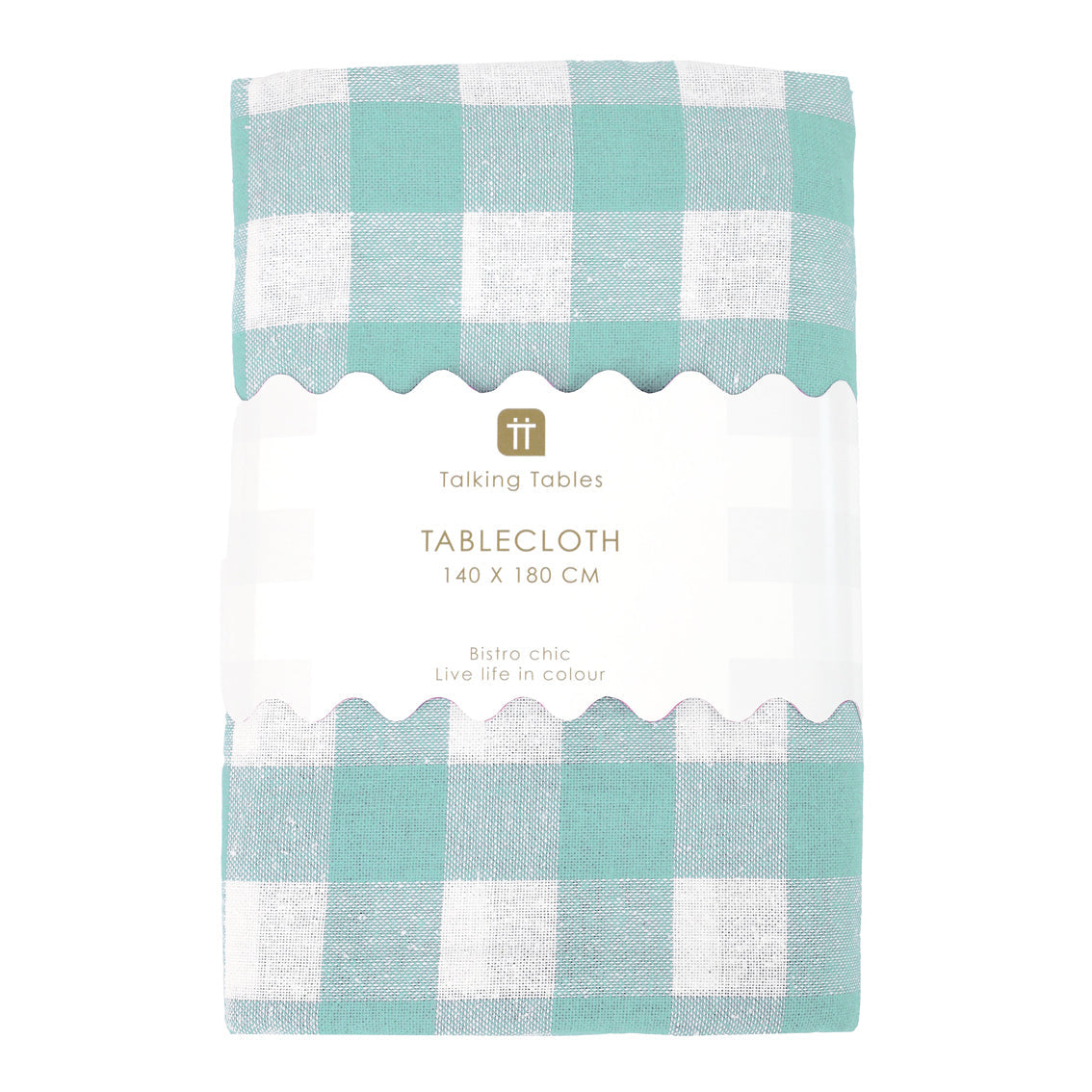 Mantel de tela con estampado de vichy en color menta. Podrás reutilizarlo las veces que quieras. Mide 140×180 cm.