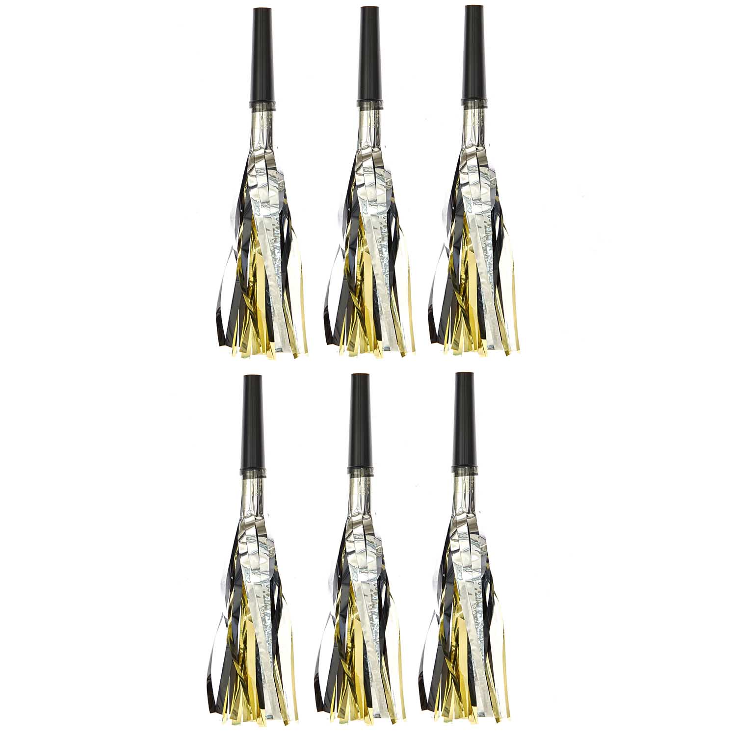 Dale un toque divertido a tus fiestas con estas 6 matasuegras negras con tiras metalizadas en dorado y plata.